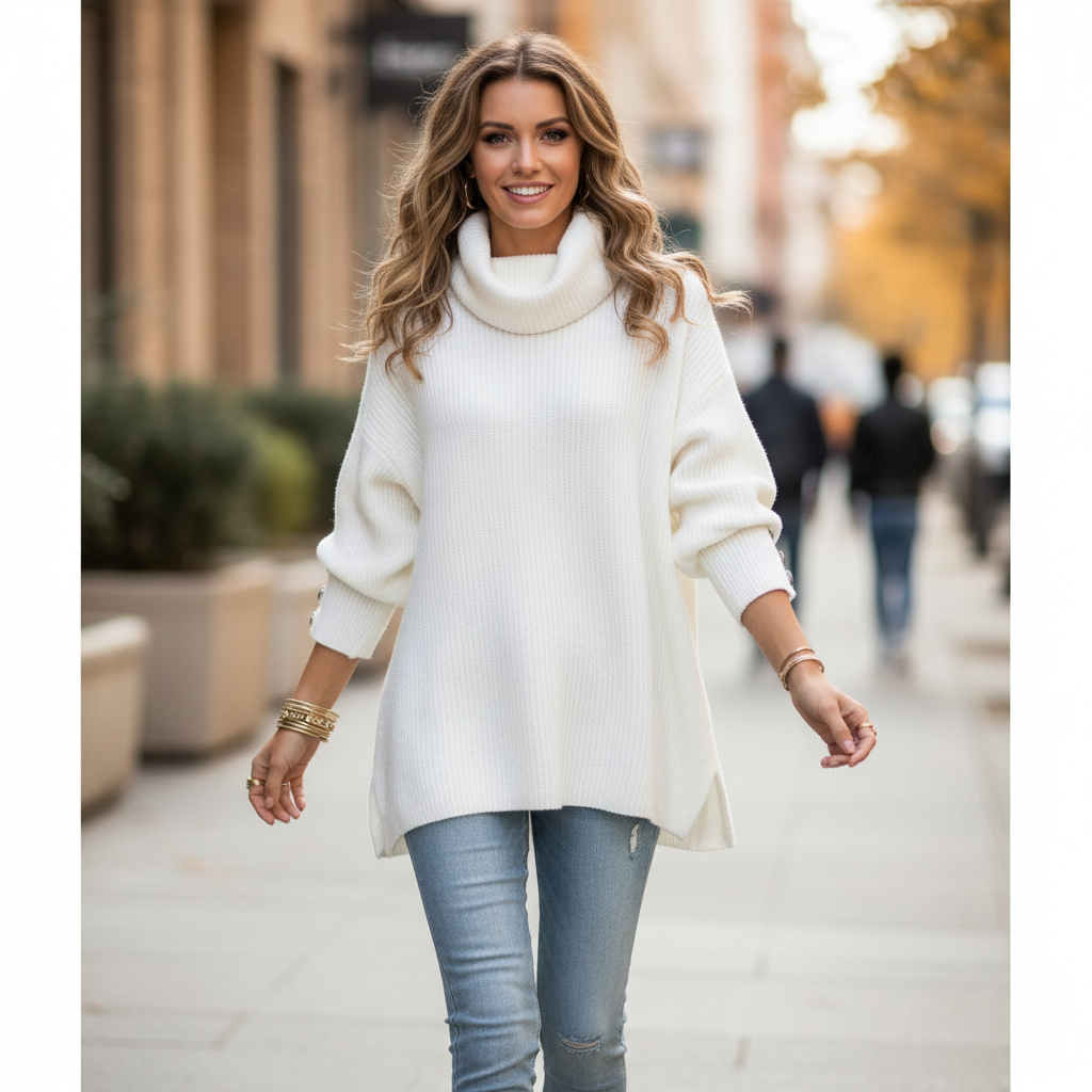Ervaar de perfecte mix van comfort en elegantie met deze oversized gebreide coltrui. Ideaal voor casual dagen en koelere avonden, verkrijgbaar in diverse kleuren en maten.
